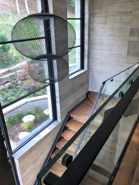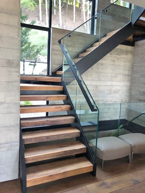 Nu staan de twee bordestrappen stevig op hun plaats. Het resultaat is werkelijk adembenemend. De combinatie van de stalen constructie, de houten treden met ledverlichting en de glazen balustraden creëert een unieke en elegante uitstraling die perfect past bij zowel de woning als het bijbehorende guesthouse.