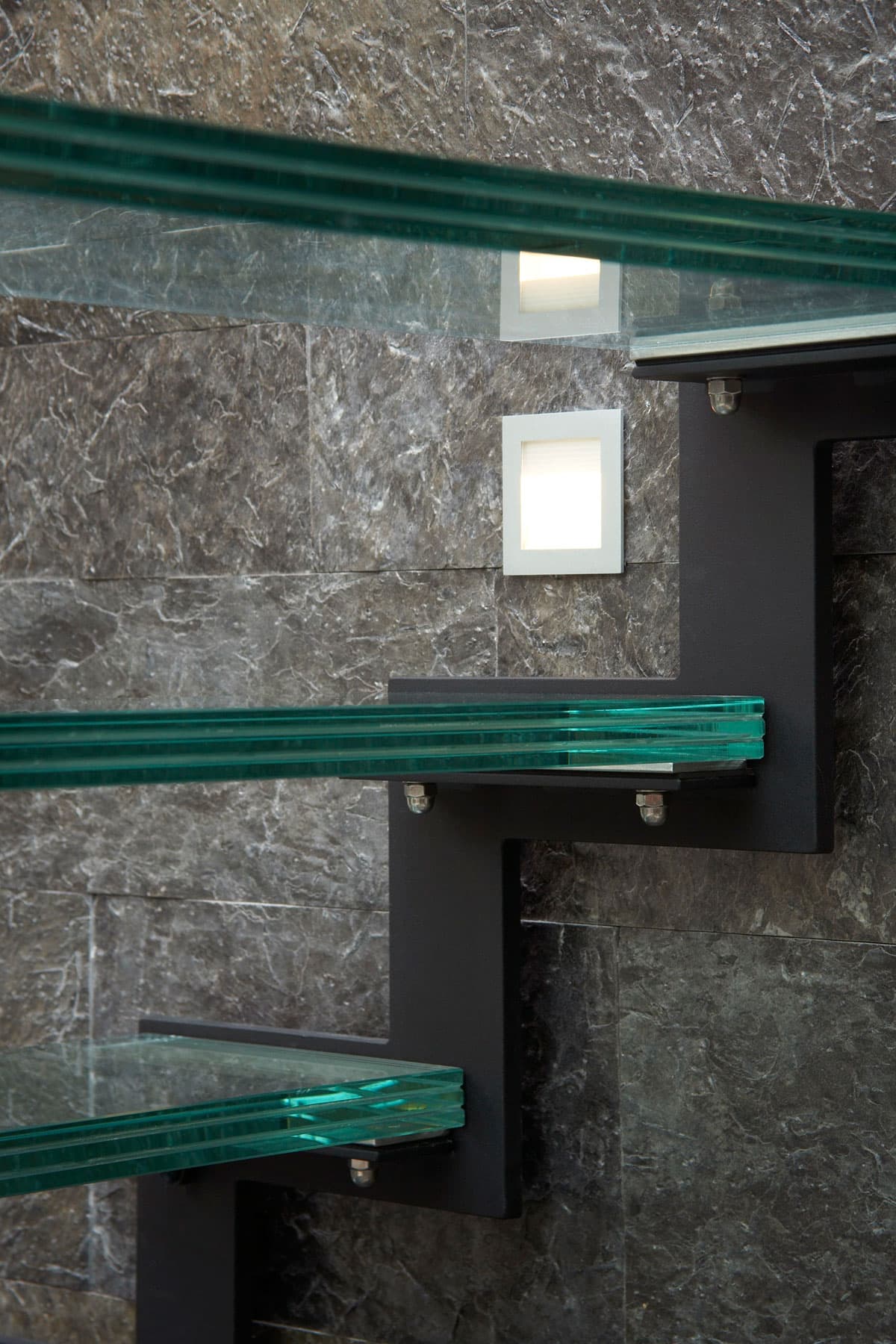 Transparant en dus licht doorlatendToepasbaar op veel types design trappenLED verlichting kan de trap in elke sfeer brengenGlazen trappen vallen in een hoger prijs segmentHet gebruikte materiaal van glazen trappen voor het trapframe is zeer afhankelijk van het type trap.